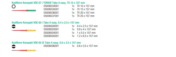 - Varillas VDE intercambiables (de 157 mm) con la función práctica de poder realizar movimientos giratorios rápidos, sistema antirrodamiento y sistema de búsqueda de herramientas Take it easy: con marcas a color según el perfil e indicaciones del tamaño grabadas con láser
